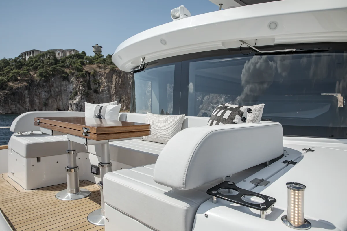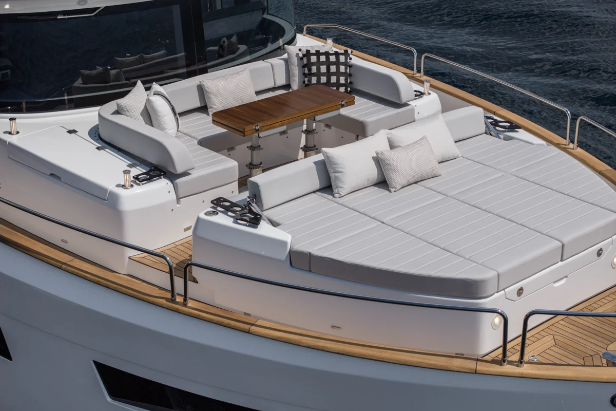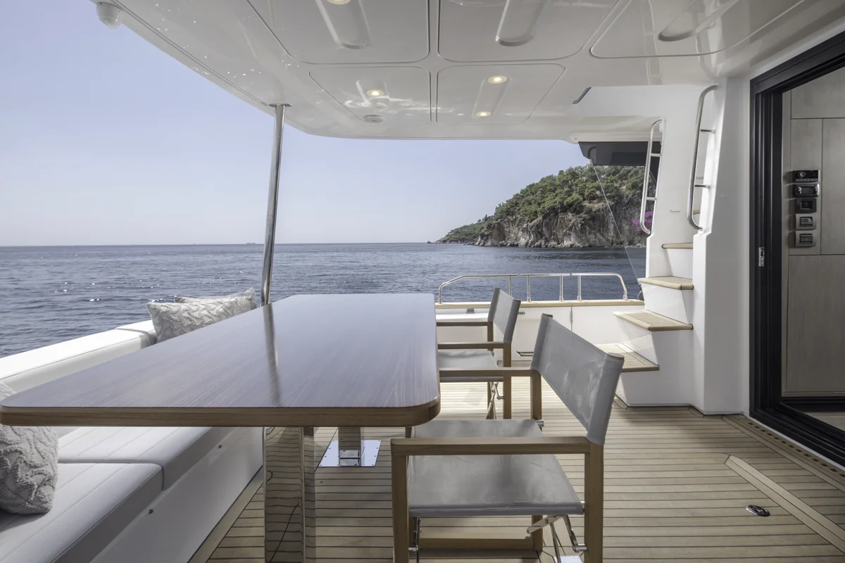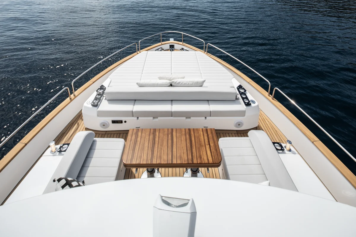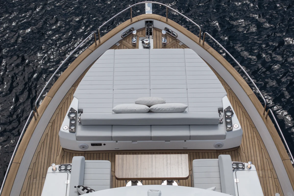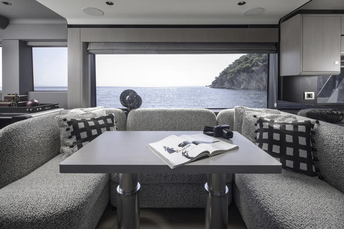 Det rummelige hoveddæk tilbyder panoramaudsigt gennem store vinduer, der giver naturligt lys og en fantastisk følelse af nærhed til havet. Sirena 60 er designet til både privatliv og sociale stunder med et åbent layout, hvor salon, køkken og spiseområde smelter sammen til ét imponerende opholdsrum.