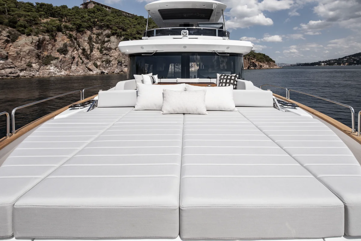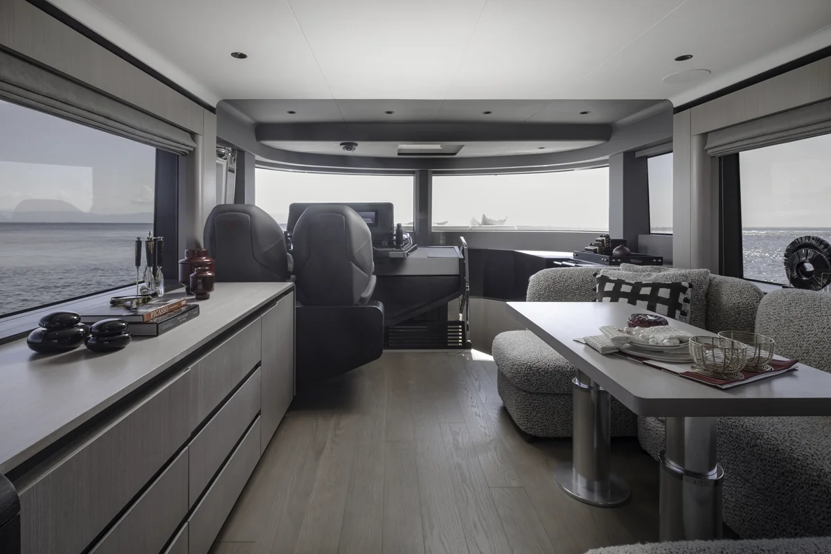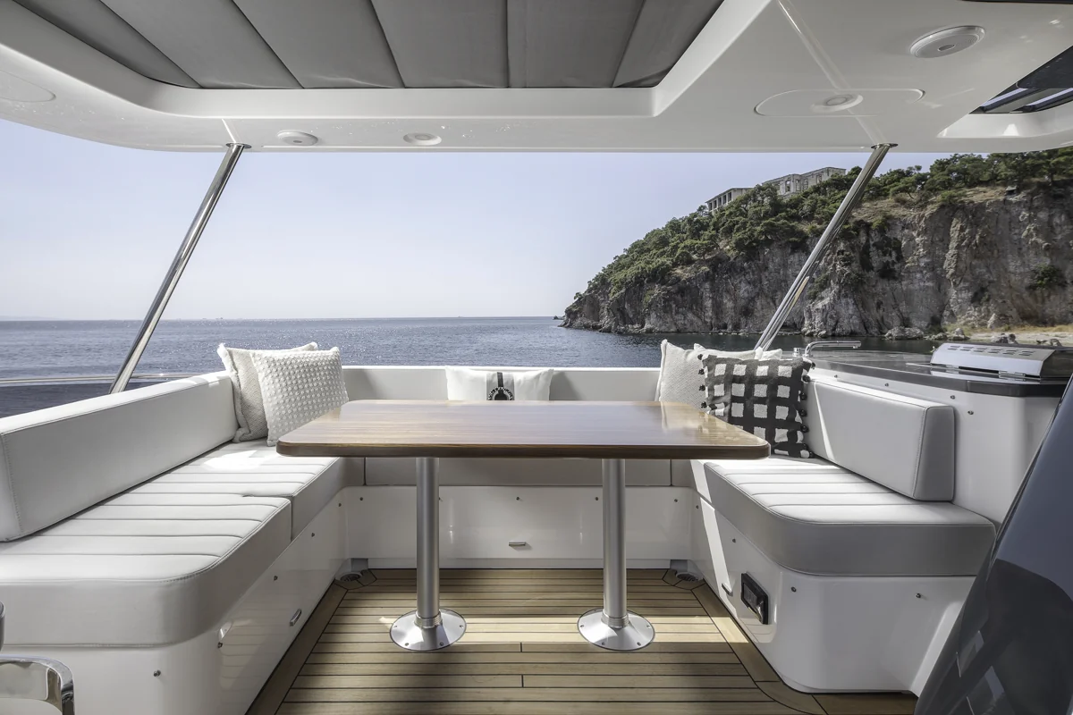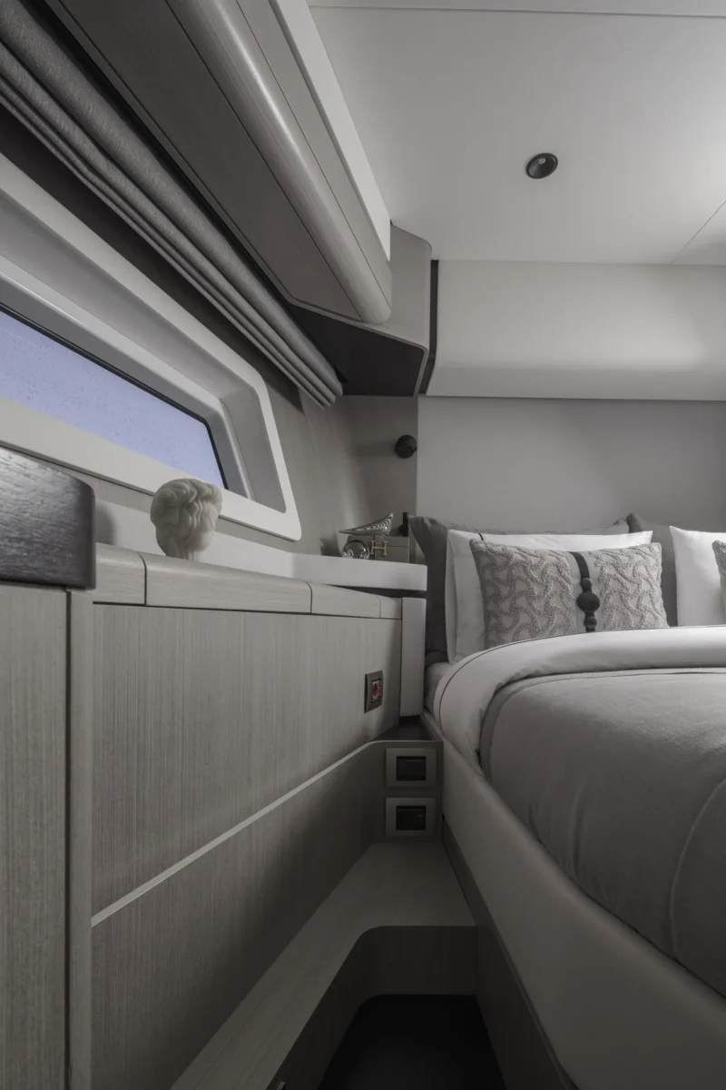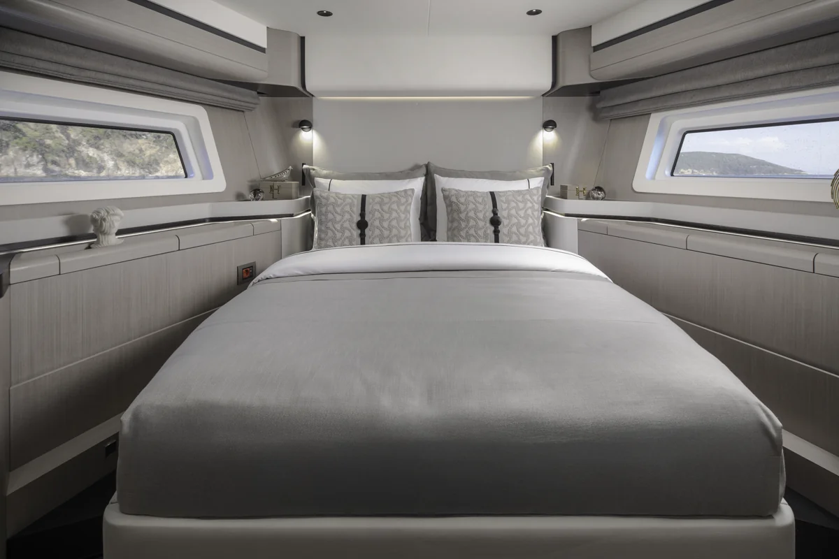 Det rummelige hoveddæk tilbyder panoramaudsigt gennem store vinduer, der giver naturligt lys og en fantastisk følelse af nærhed til havet. Sirena 60 er designet til både privatliv og sociale stunder med et åbent layout, hvor salon, køkken og spiseområde smelter sammen til ét imponerende opholdsrum.