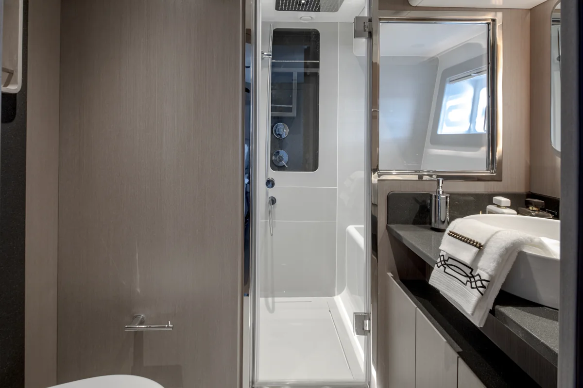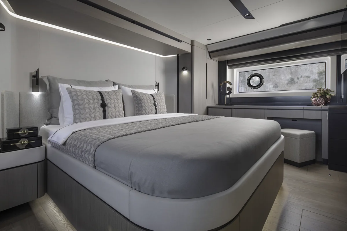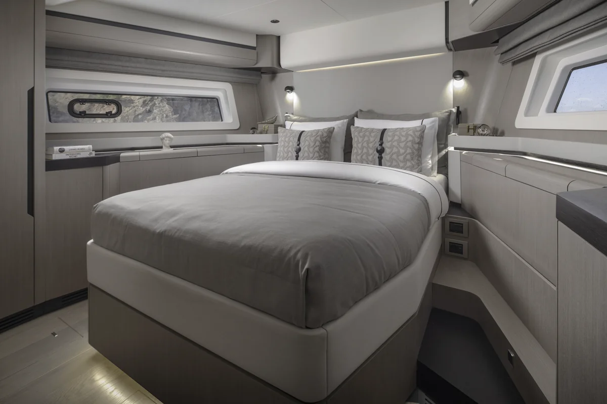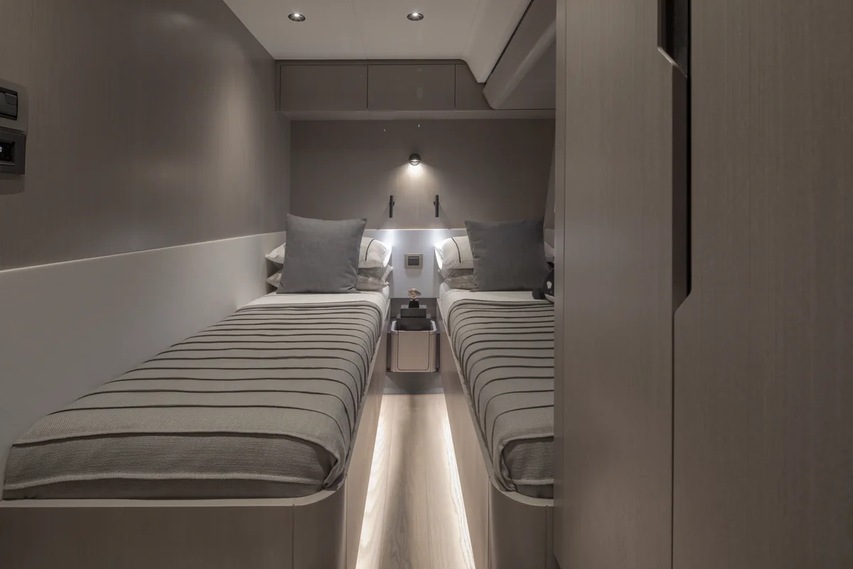 Med tre luksuriøse gæstekabiner, inklusive en stor masterkabine midtskibs og en komfortabel VIP-kabine forude, er Sirena 60 perfekt indrettet til at byde familie og venner velkommen i eksklusive omgivelser. Alle kabiner har eget bad, og interiøret byder på elegante materialer af højeste kvalitet, som skaber en atmosfære af afslappet elegance.