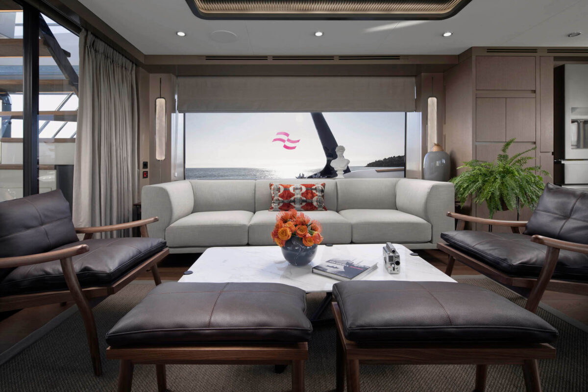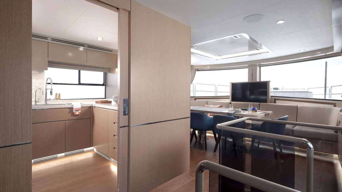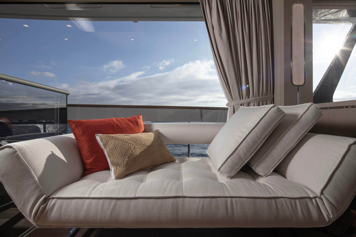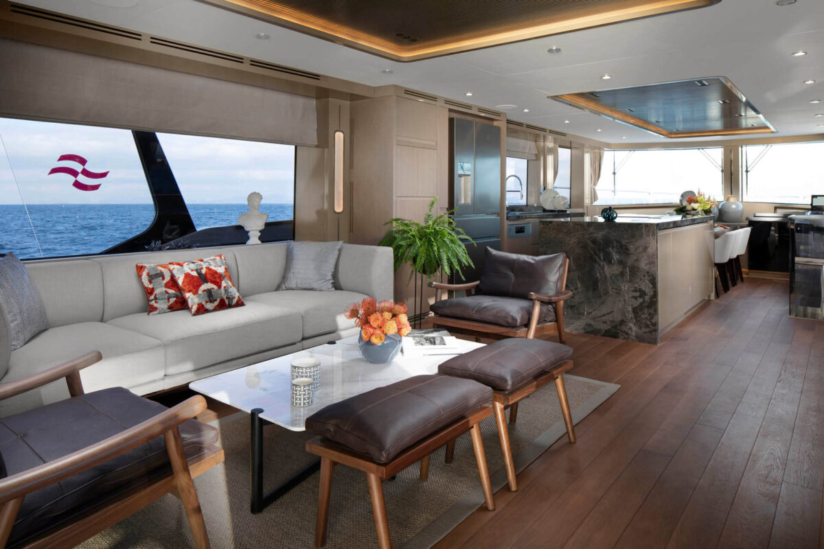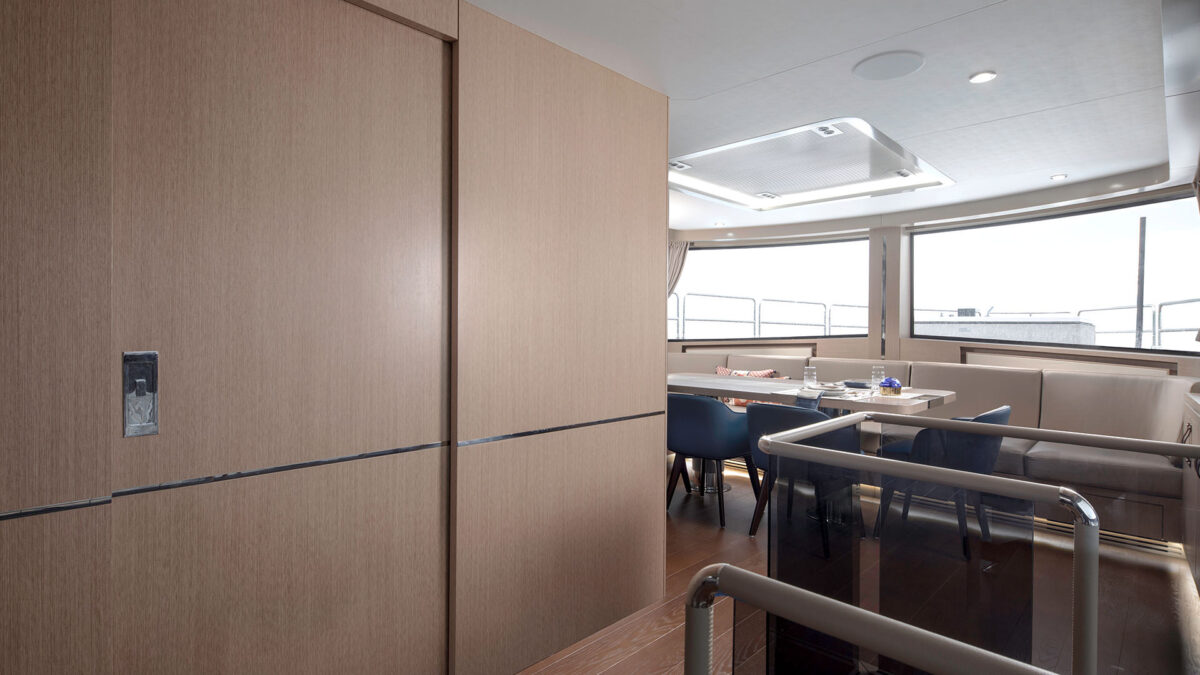 Sirena 78’s interiør er designet til at imponere selv de mest kræsne. Indenfor mødes man af en rummelig salon med store vinduer, der inviterer masser af naturligt lys og giver panoramaudsigt til havet. Indretningen føles som en moderne luksuslejlighed på havet – med elegante materialer, lyse farver og nøje udvalgte detaljer for en eksklusiv atmosfære.