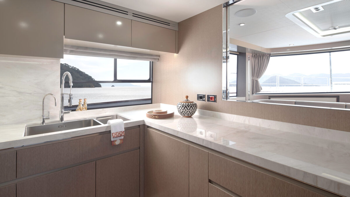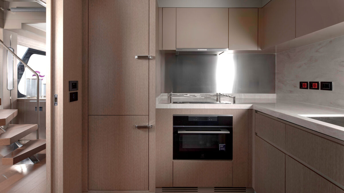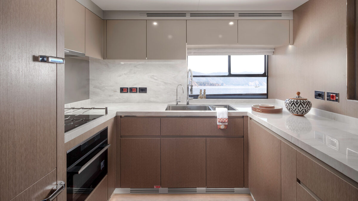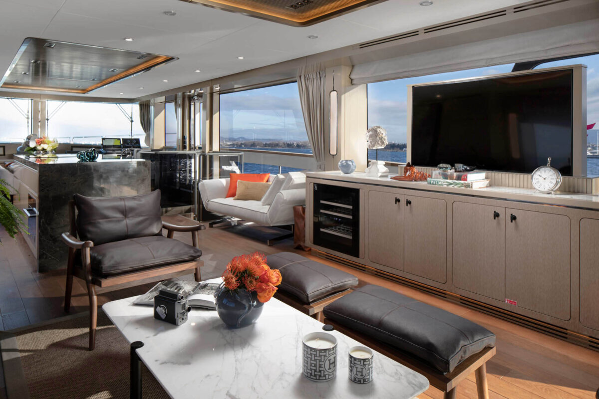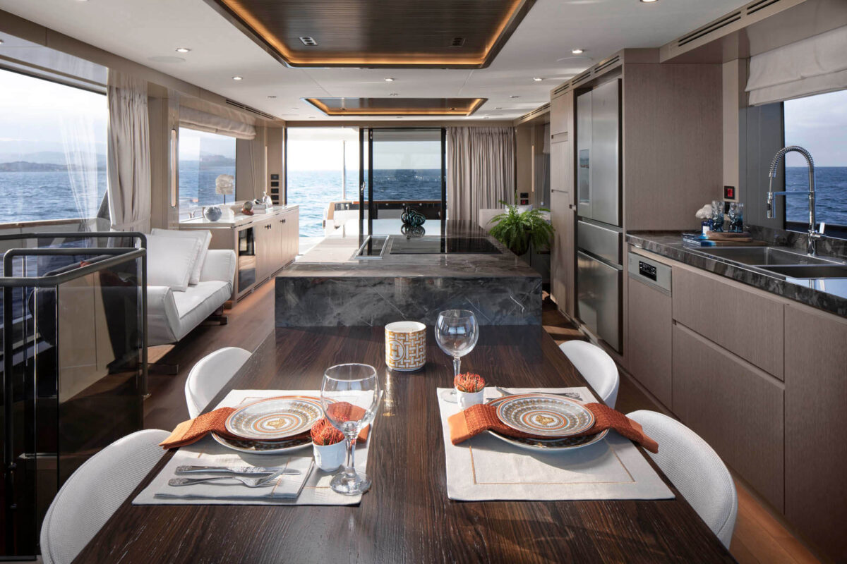 Sirena 78’s interiør er designet til at imponere selv de mest kræsne. Indenfor mødes man af en rummelig salon med store vinduer, der inviterer masser af naturligt lys og giver panoramaudsigt til havet. Indretningen føles som en moderne luksuslejlighed på havet – med elegante materialer, lyse farver og nøje udvalgte detaljer for en eksklusiv atmosfære.