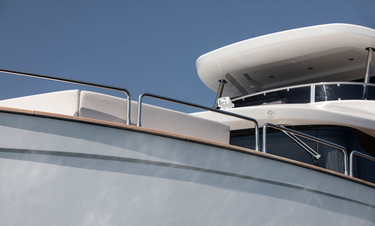 Flybridgen, designet i samarbejde med anerkendte Cor D. Rover, er et af yachtens højdepunkter. Ejer kan vælge en åben flybridge med masser af sol og frisk luft, en semi-inddækket version for øget læ eller en fuldt lukket flybridge med klimakontrol, der fungerer som en ekstra indendørs skylounge.