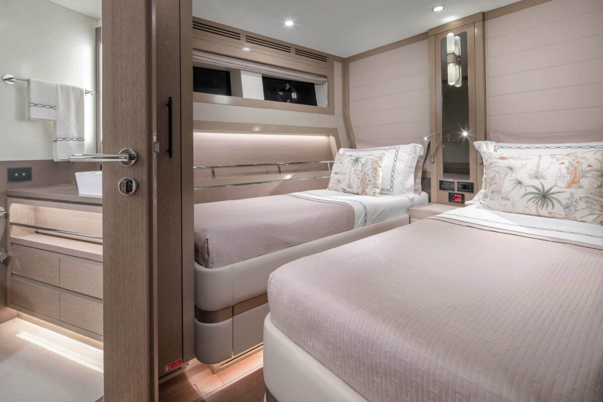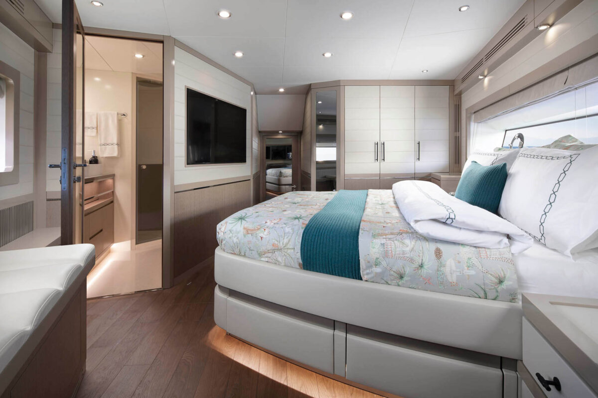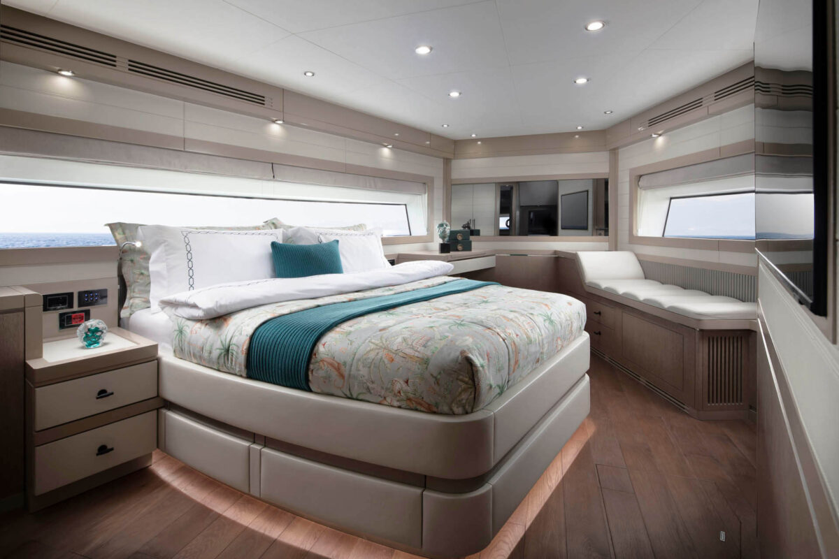 Master suiten, der strækker sig over yachtens fulde bredde, byder på king-size seng, eget luksusbadeværelse og walk-in garderobe. Tre yderligere gæstekahytter (inklusive VIP-suite) sikrer, at alle ombord nyder femstjernet komfort. Med i alt fire badeværelser samt separat besætningsområde er bekvemmeligheden sikret, selv når yachtens fulde kapacitet udnyttes.