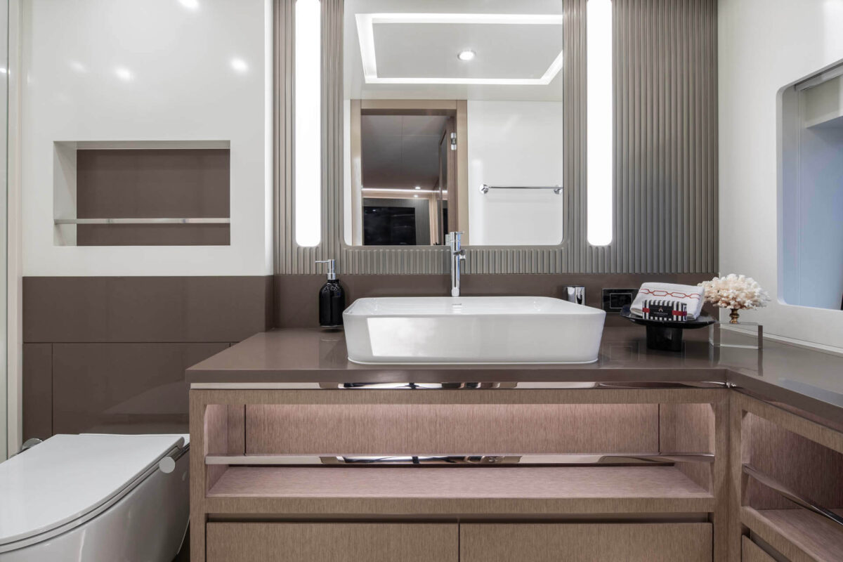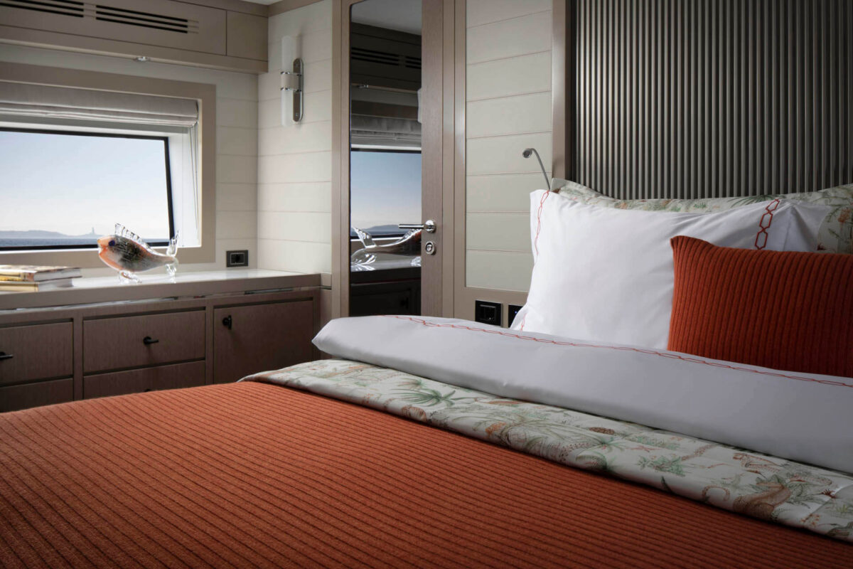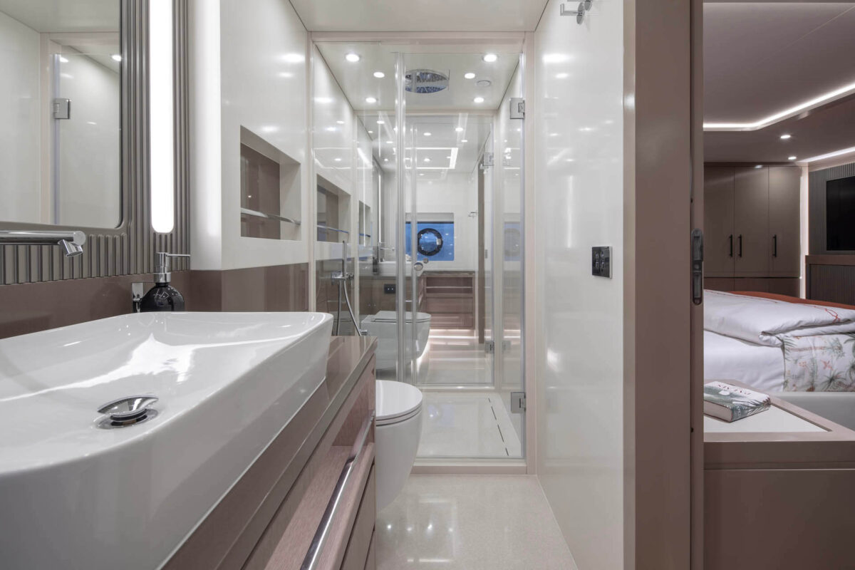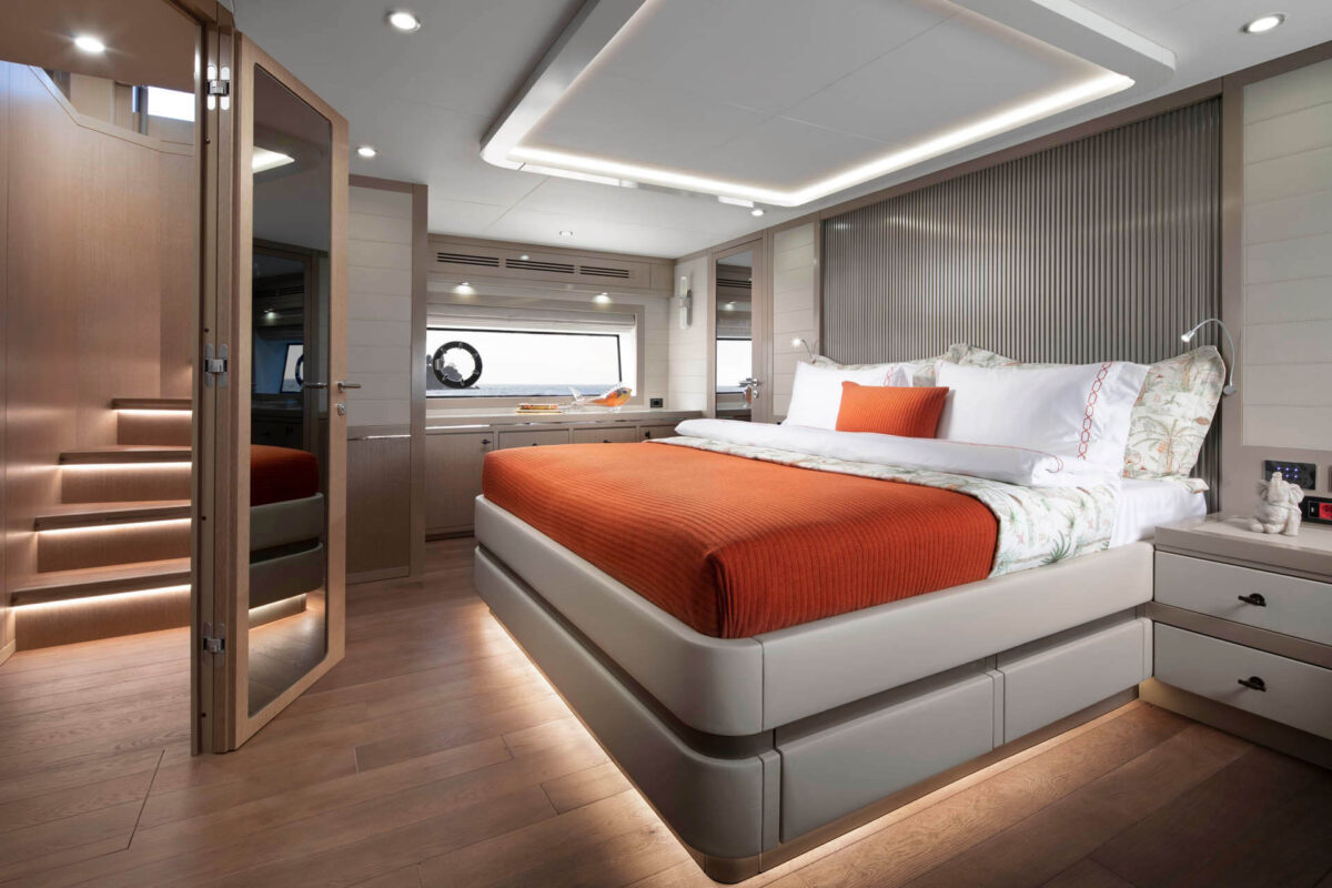 Master suiten, der strækker sig over yachtens fulde bredde, byder på king-size seng, eget luksusbadeværelse og walk-in garderobe. Tre yderligere gæstekahytter (inklusive VIP-suite) sikrer, at alle ombord nyder femstjernet komfort. Med i alt fire badeværelser samt separat besætningsområde er bekvemmeligheden sikret, selv når yachtens fulde kapacitet udnyttes.